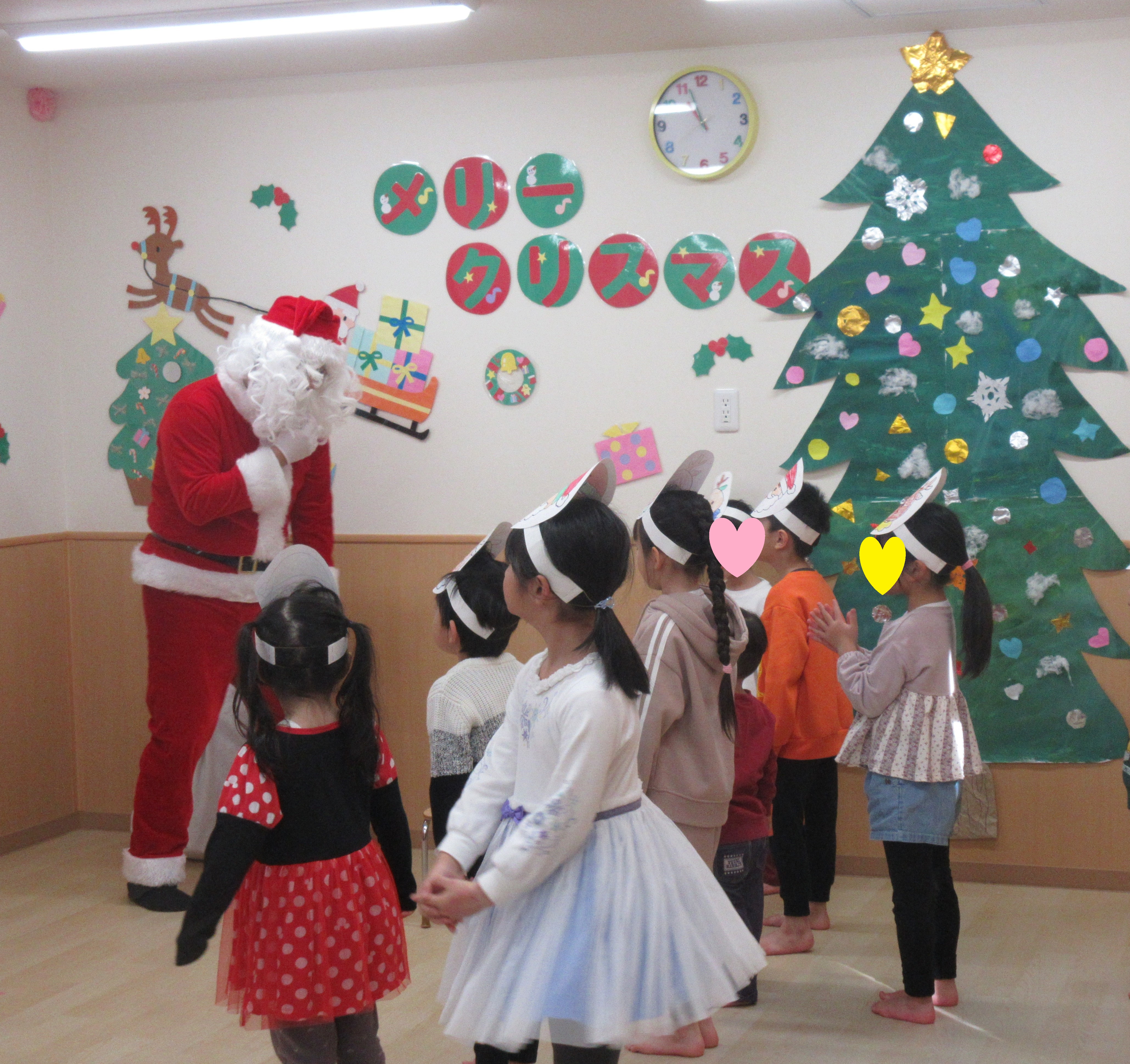 サンタさんの周りに子ども達が集まり『サンタさんどうやって帰るの? トナカイ?車?あかでん?』との質問に『トナカイを上島駅に待たせてあるから、トナカイに乗って帰るよ!』との答えにビックリしたり、『また来年来るよ~』のサンタさんの言葉に『来年は小学校だよ!』など、大好きなサンタさんとの会話に会場が柔らかい空気に包まれ、お父さん・お母さんと一緒の楽しいクリスマス会も終わってしまいました。